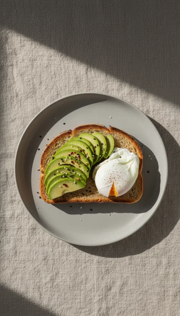 Description: This isn’t just avocado toast; it’s a statement. By focusing on perfect ingredients—a single slice of rustic sourdough, fanned avocado, and a flawlessly poached egg—you create a composition that is both familiar and strikingly elegant. A simple sprinkle of flaky sea salt and black pepper is the only adornment needed.