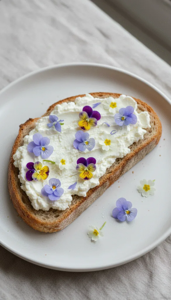 - Ingredients: 1 thick slice of sourdough, 1/4 cup fresh ricotta, assorted edible flowers (like pansies, violas), fresh herbs (dill, thyme), a drizzle of honey.