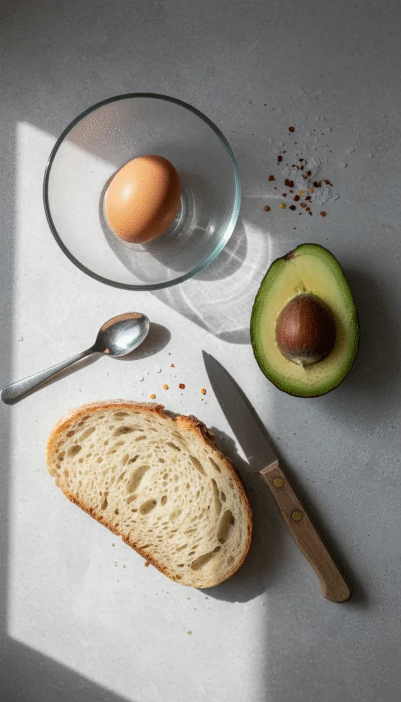 - Ingredients: 2 large, cold eggs, 2 thick slices of sourdough, 1 ripe avocado, salt, pepper, parchment paper.